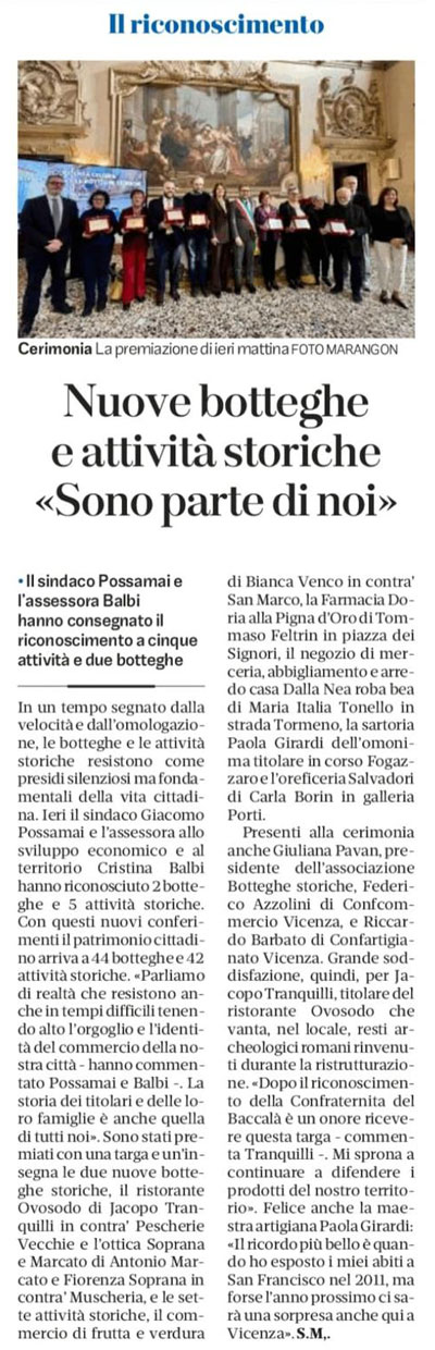 Il 15 dicembre 2025, nela sala Stucchi di Palazzo Trissino, la Sartoria Paola Girardi ha ricevuto il riconoscimento di Attività Storica della Città di Vicenza.
